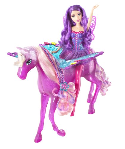 Horse with glittery wings! Stylish Barbie Purple, pink, and bright colors!This Fab Fairy with intricate glittery wings comes with her beautiful sparkling Fairy horse that girls can decorate the wings with beautiful gems! Doll stands about 11-inches tall. Her horse measures about 10-inches tall.