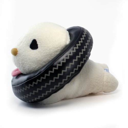 Tire Dog 6" plush of a puppy stick in a leather-style tire. Import product with a Japanese text tag. Packaged in a plactic bag.