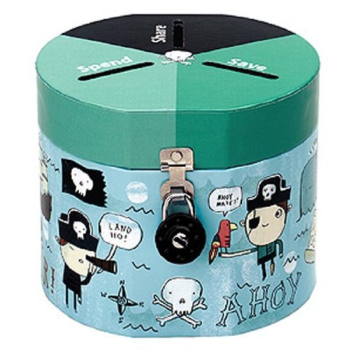 What could me more fun than shaking your piggy bank to hear the change rattle around! And with this Pirate bank from Mudpuppy, youll have funds to share, to spend, and to save. After all, treasure chests are such an old-fashionede way to store the plunder!This Pirates bank was illustrated by Mike Lowery.These heavy laminated paper on board banks have a metal hasp, colorful padlock, and keys and best of all, a hinged lid so they dont have to be smashed to make a withdrawal!Sturdy laminated paper on board construction4" high, 4-1/2" diameterColor-coordinated padlock with 2 keysHinged lid with 3 slots: Save, Spend, ShareThree interior compartmentsMade with a minimum of 70% recycled paperPrinted with nontoxic, soy-based inksCE and ASTM tested for safetyAges 5+*** Product Information and Prices Stored: May 19, 2011 09:32:18